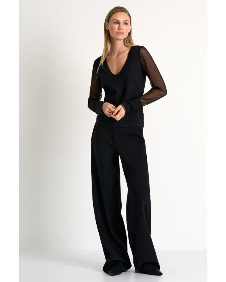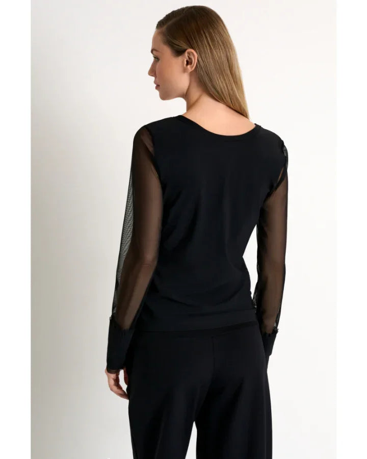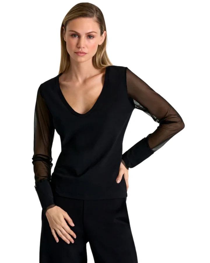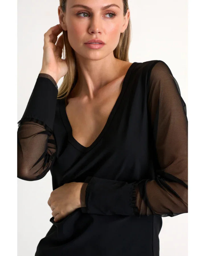 Shan elegant lycra top featuring a flattering V-neckline, sheer mesh long sleeves with ruched cuff accents and a body-hugging fit. Length 23.5".