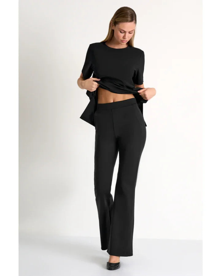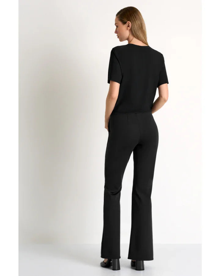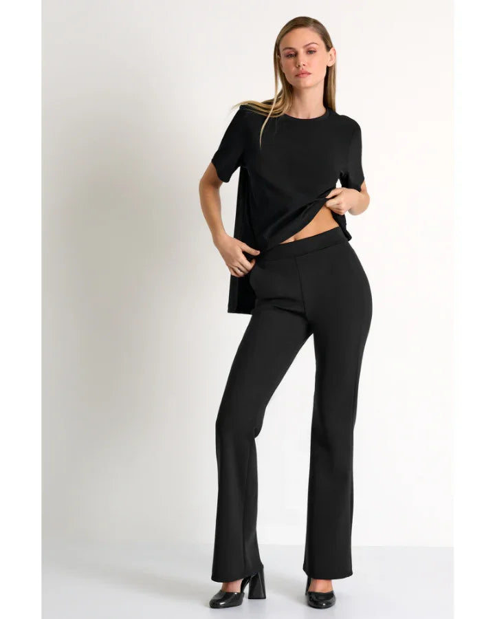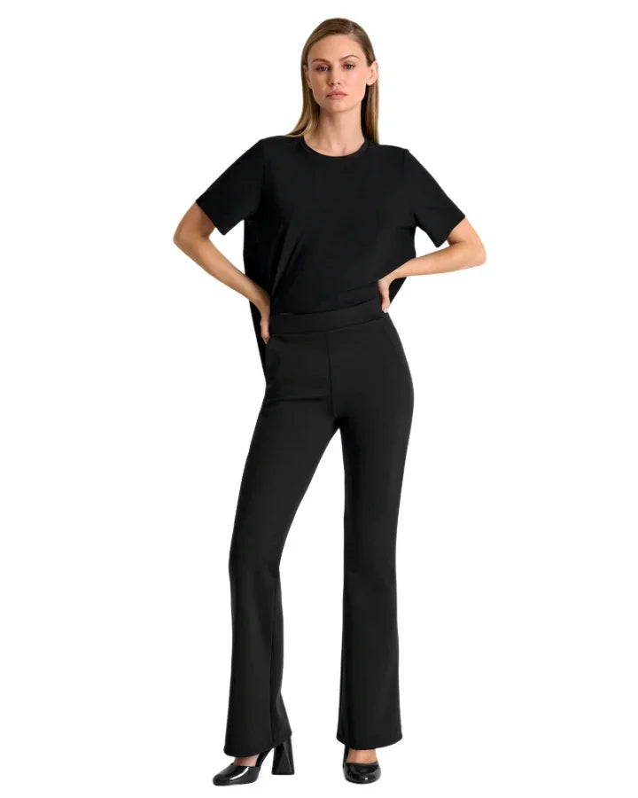 Shan classic elegant fit, soft stretch jersey 3D classic flared pull on pant with side pockets.