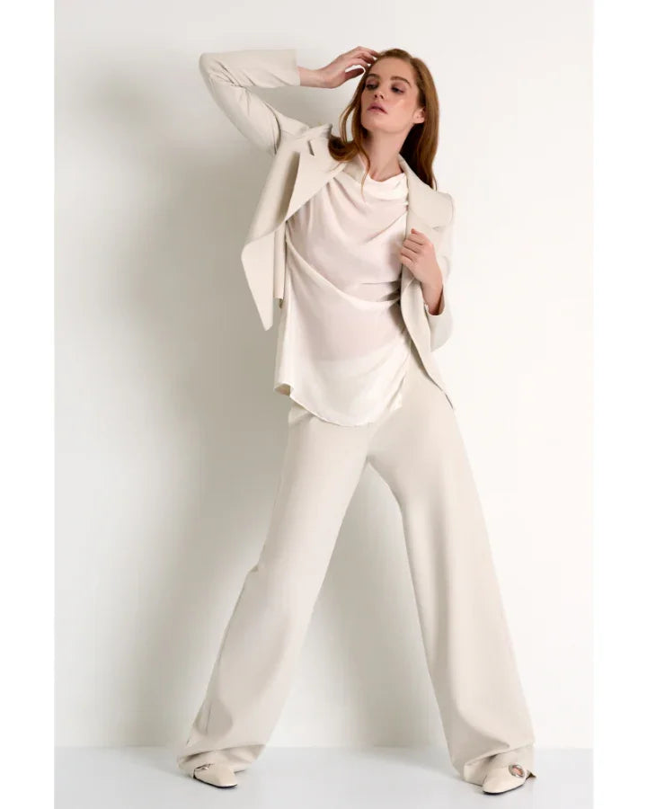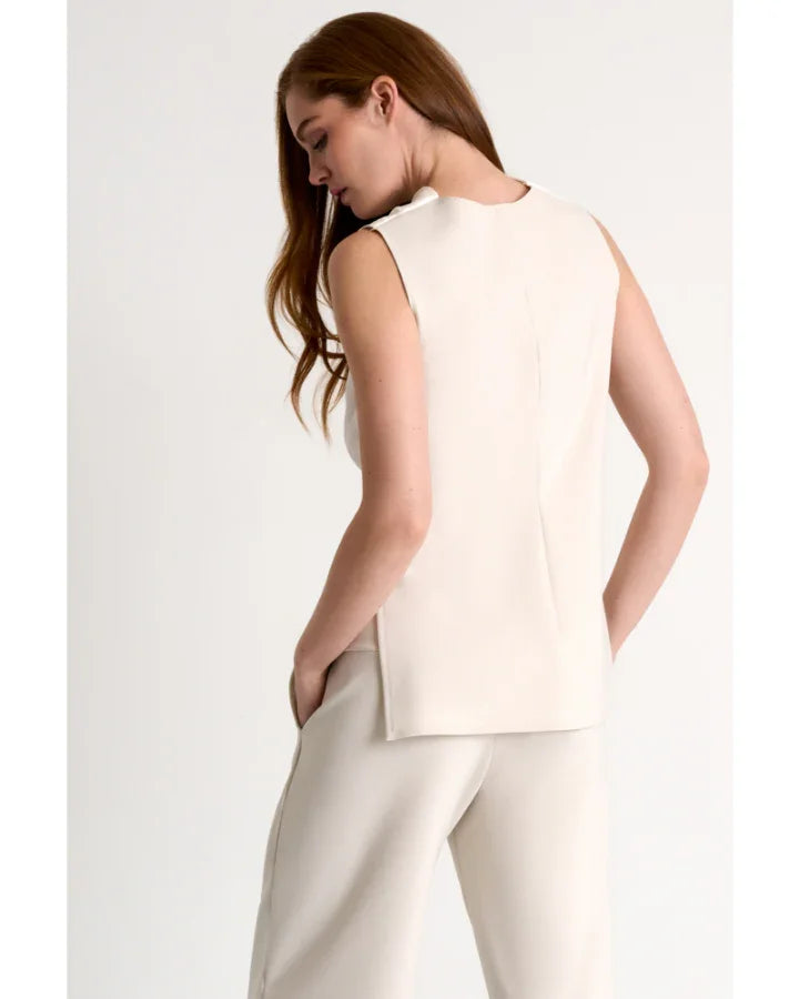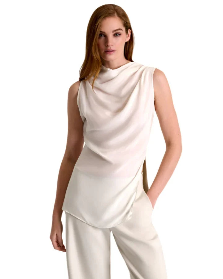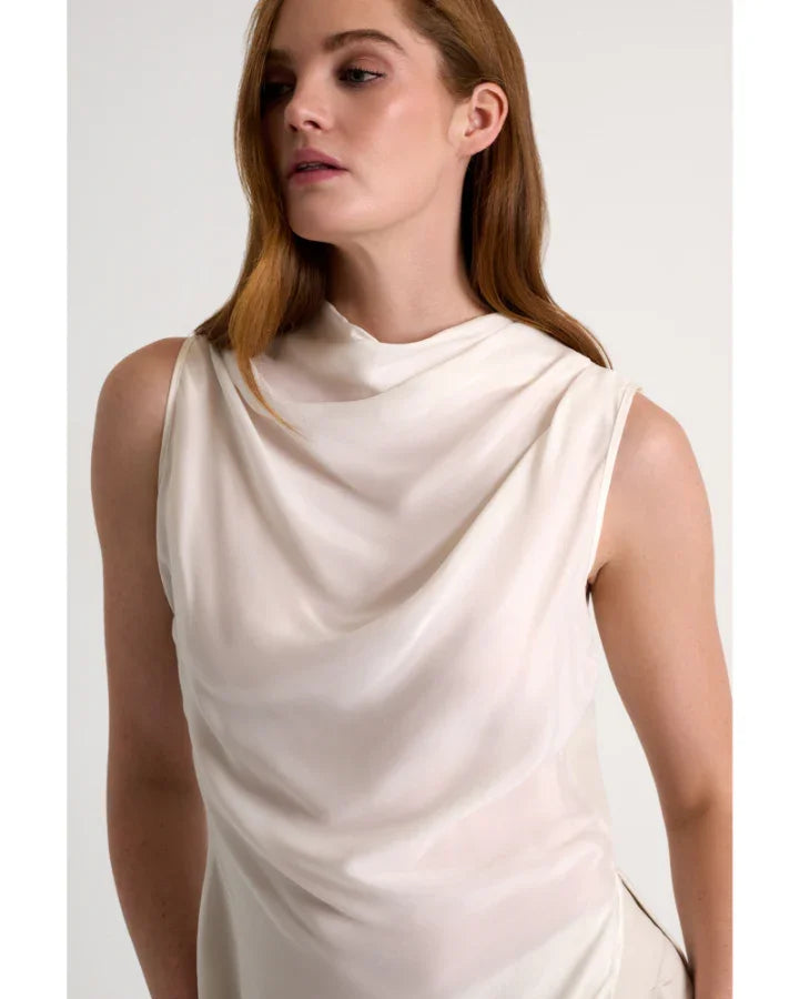 Shan elegant and timless 3D jersey cupro draped high boat neckline sleeveless blouse with side slit. Length 27.5".