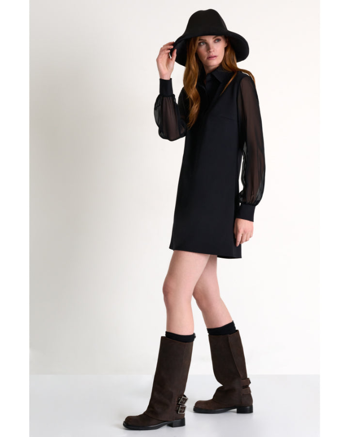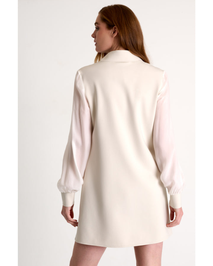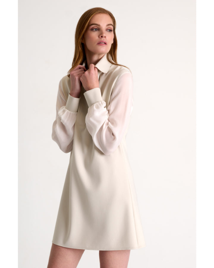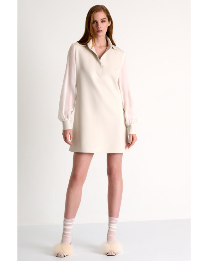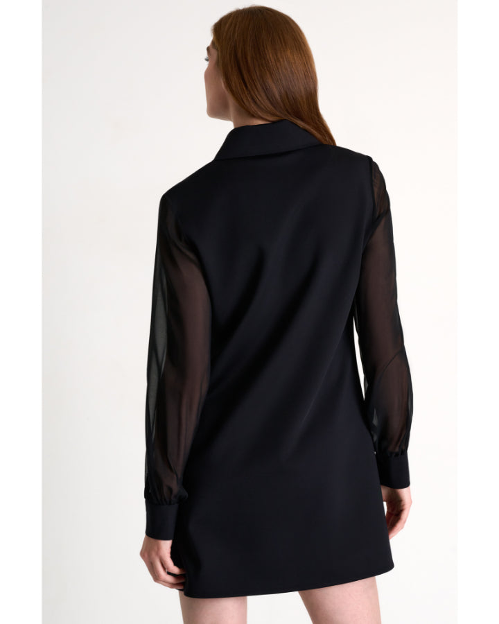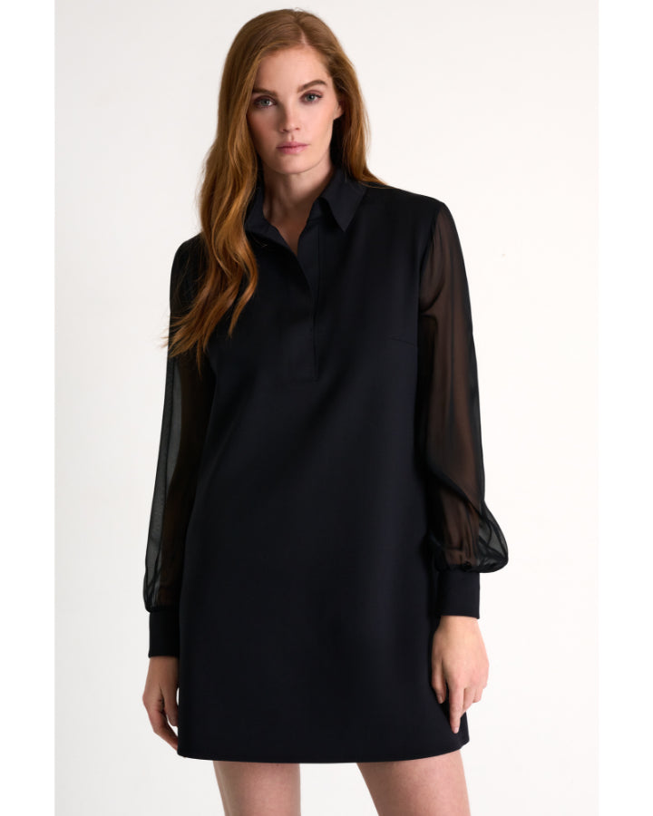 Shan elegant 3D jersey mini polo dress features classic split neck with collar and delicate mesh long sleeves. Structured and stretchable. Length 35.5".