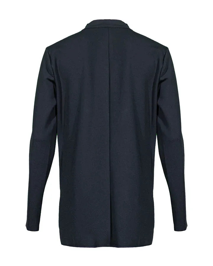 Shan 3D jersey pullover features a round split neck with lace detail, long sleeves, side slits and high low hem. Length 25.5".