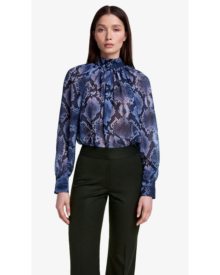 Smythe romantic silhouette snake print blouse features a mock neck and elegant gathering in a diaphanous chiffon.