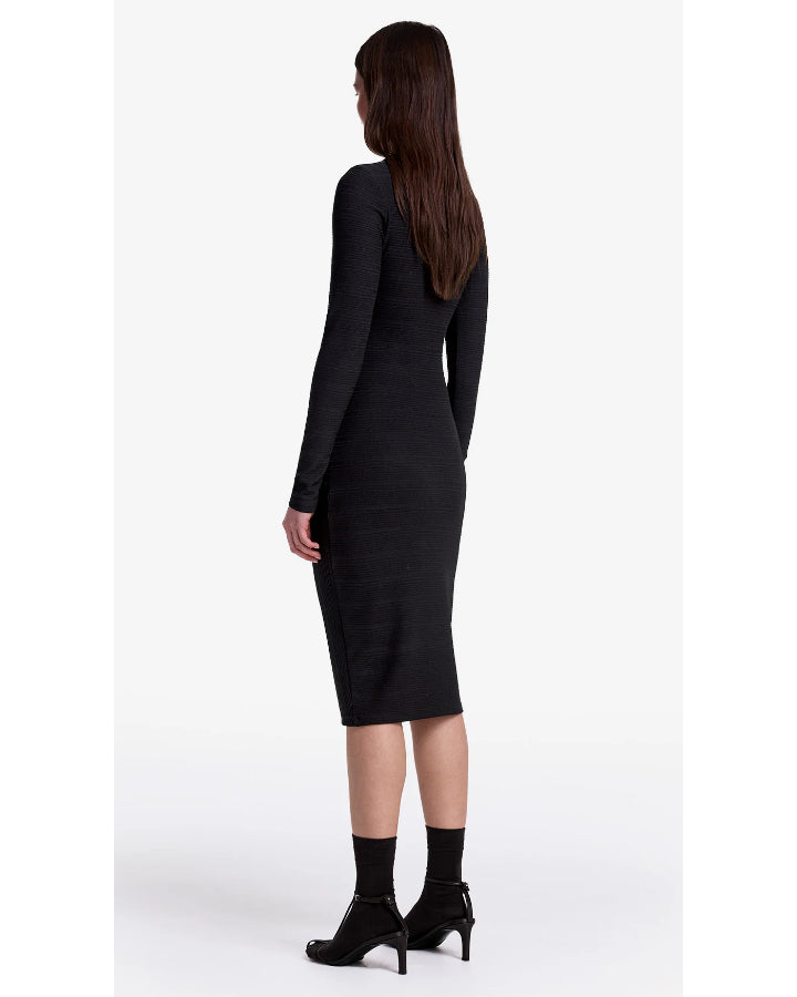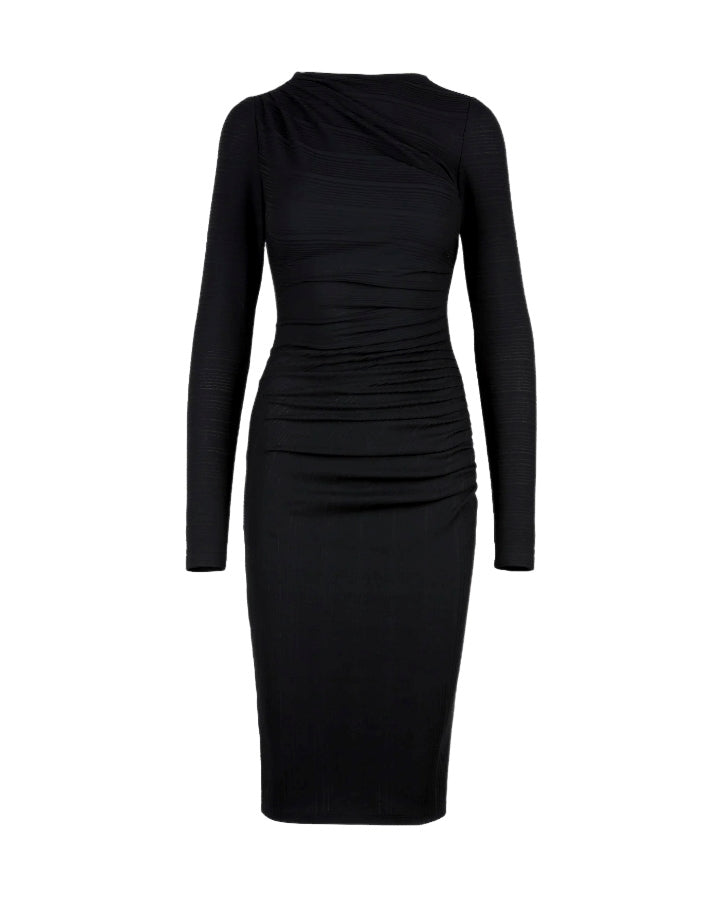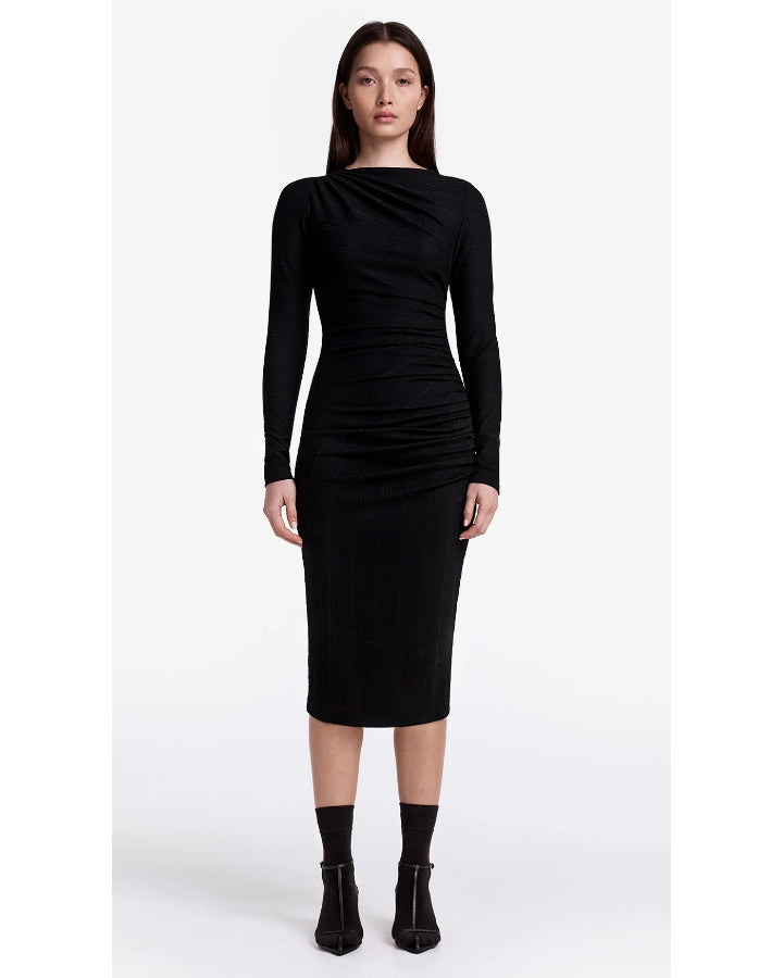 Smythe close fitting knit midi dress features tucking to create a flattering drape effect at the shoulder, waist and hips.