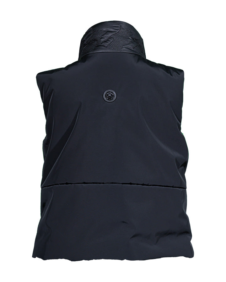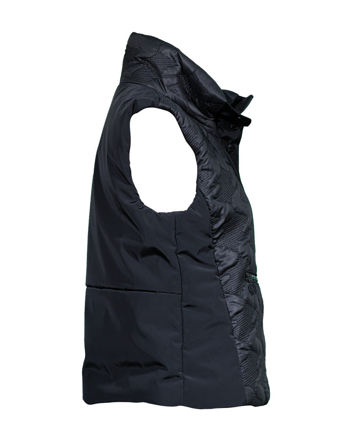 Sportalm Limiz quilted vest with a high stand-up collar, a wavy quilted pattern, a front zip pocket, and a button quarter closure.