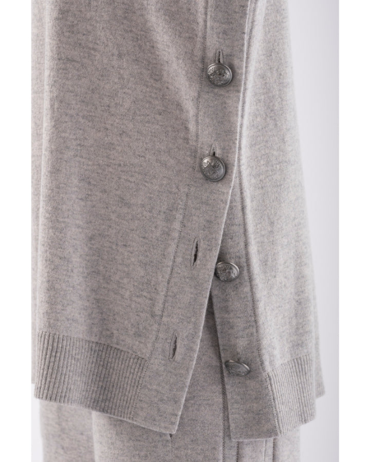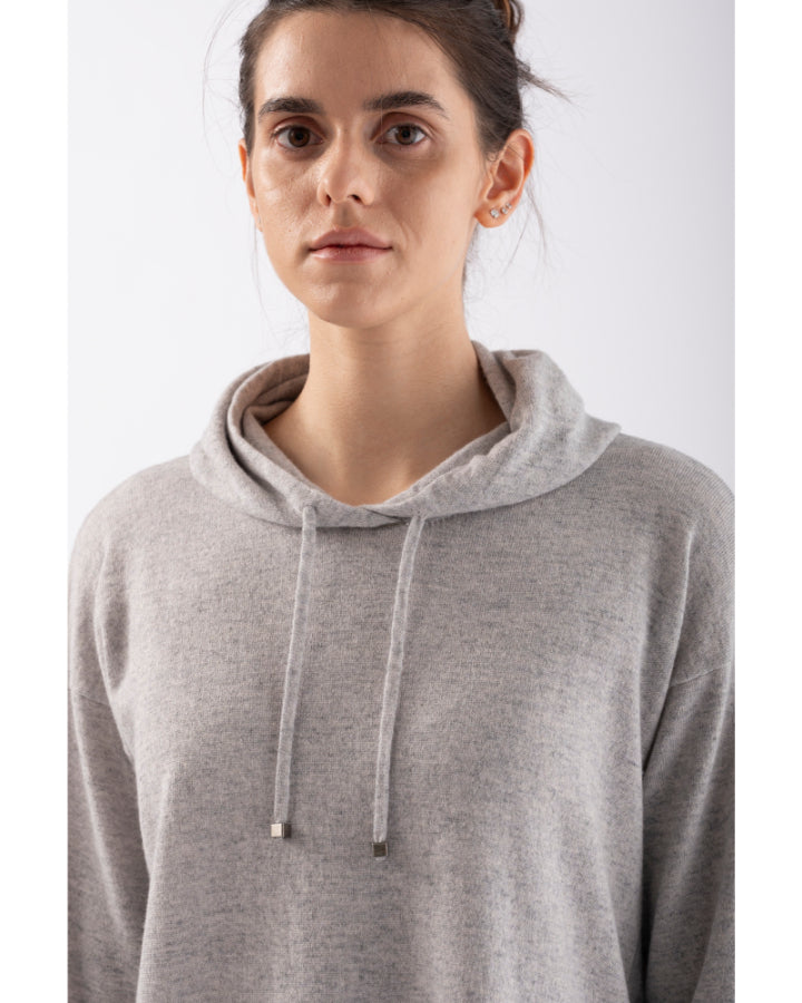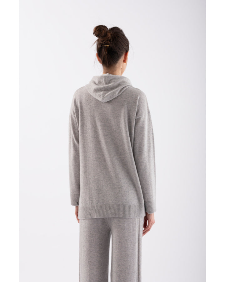 Tonet merino-cashmere blend knit hooded pullover with drawstring, left side has button down closure, finished with ribbed cuffs and hem.