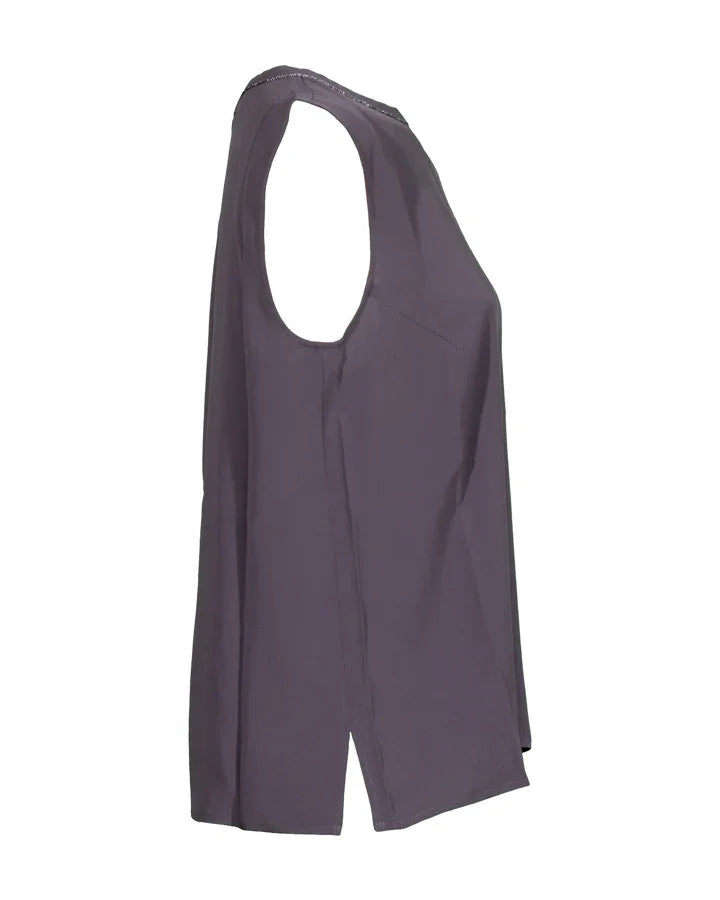 Tonet sleeveless shell which goes under any outer layer perfectly. Added metallic trim at the neck catches the eye and adds a sophisticated sparkle.