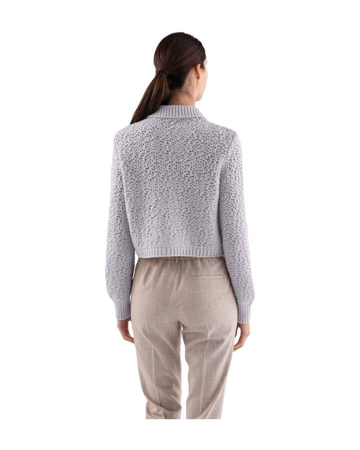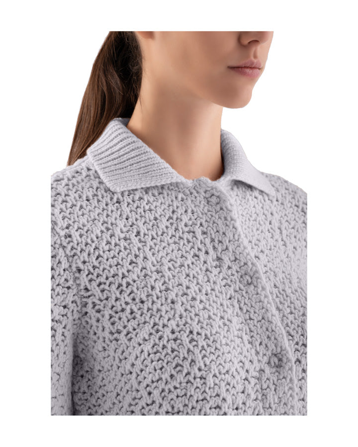 Tonet soft merino-cashmere knit cardigan in a special textured weave with collar, front slip pockets, snap button front closure and ribbed trims.