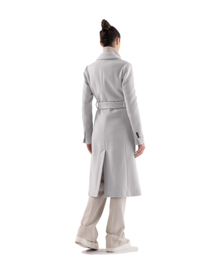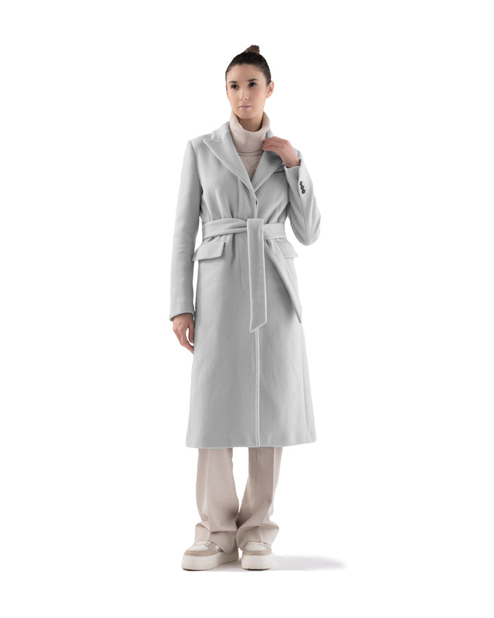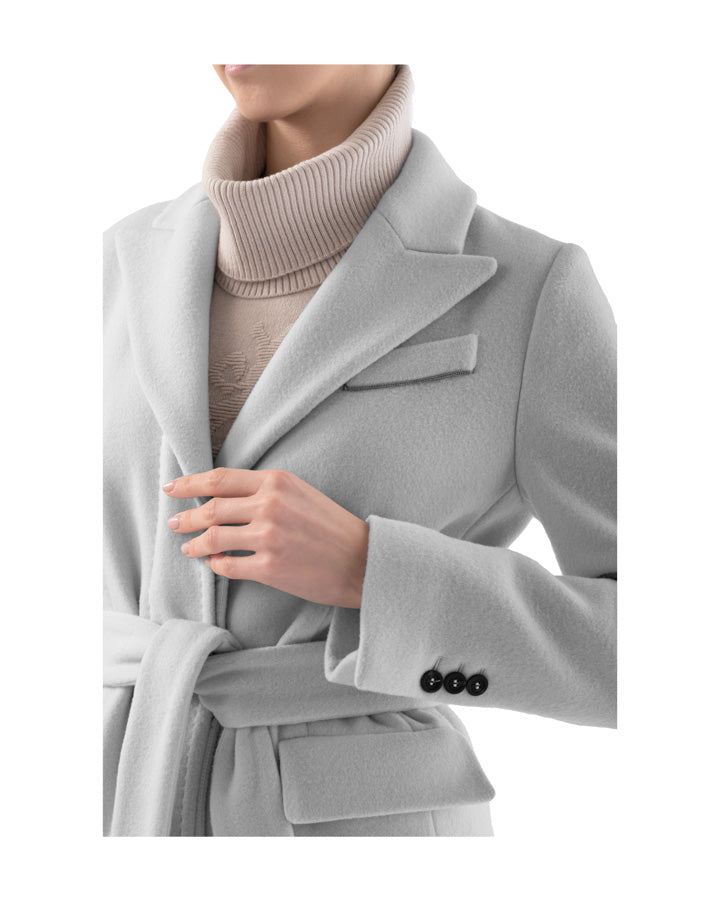 Tonet lightweight wool blend trench coat with peak lapel, concealed button front, flap pockets, back vent and tie belt.