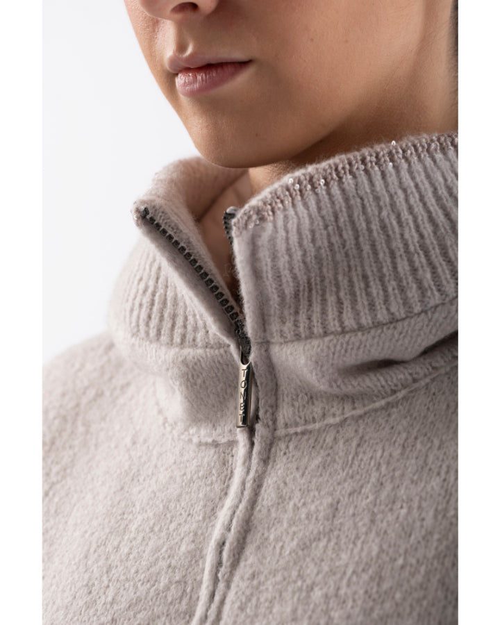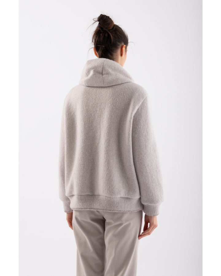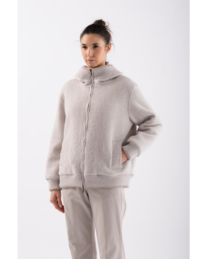 Tonet wool blend knit hip length hooded jacket with padding for extra warmth, side welt pockets, zip front closure and ribbed trims with contrast edging.