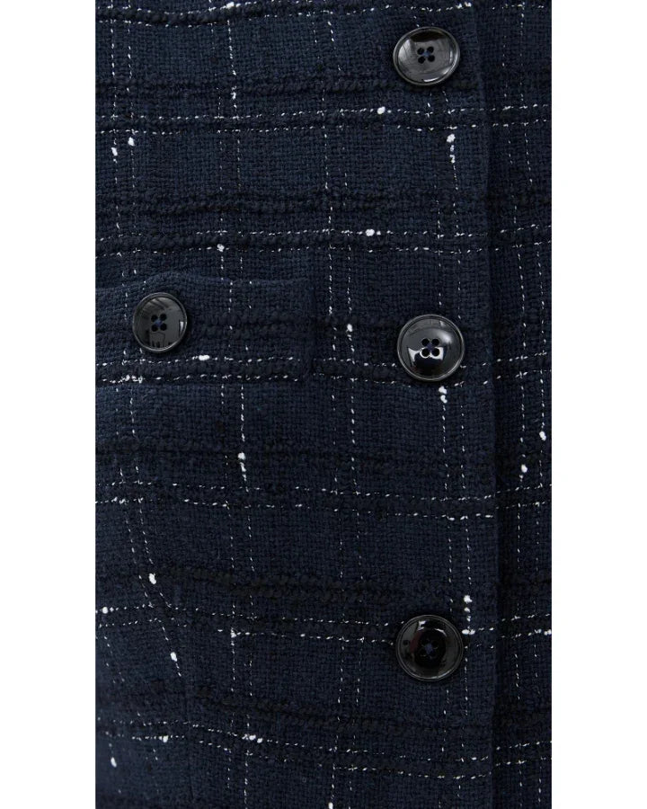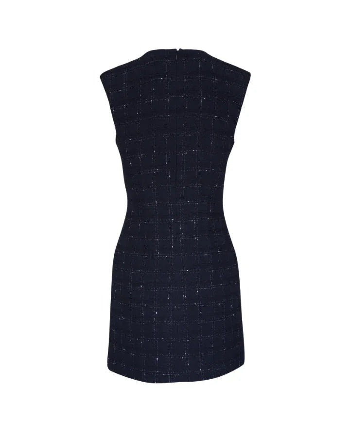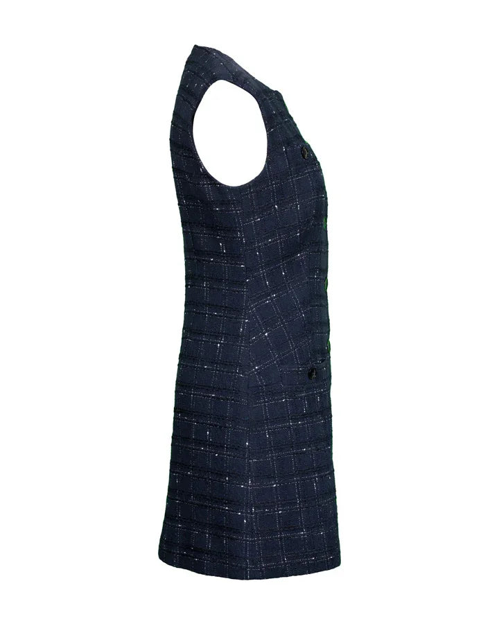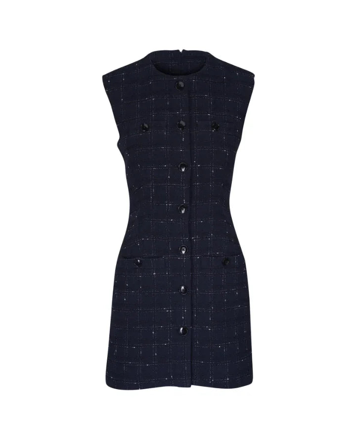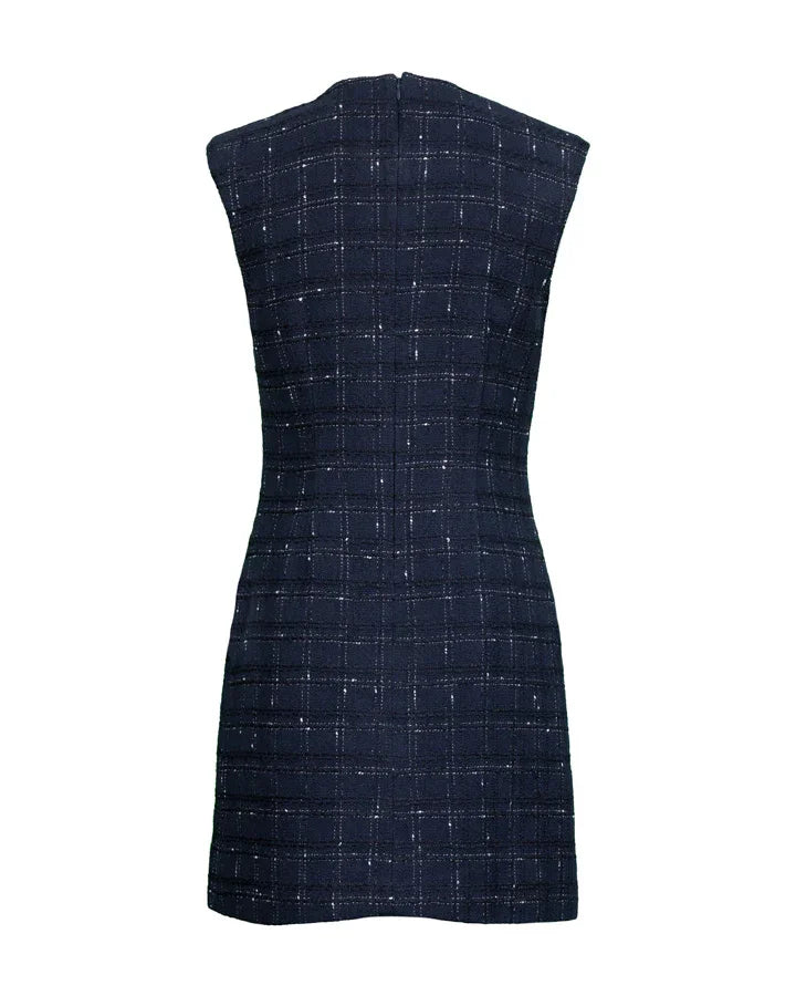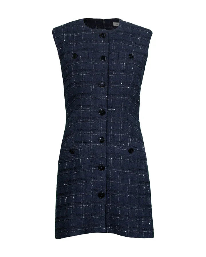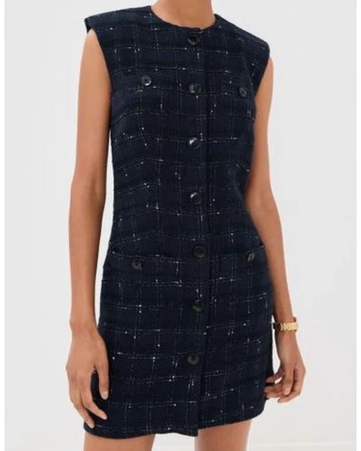 Veronica Beard mid-weight stretch tweed mini dress with crew neck, sleeveless, chest pockets with button, hip pocket with button, button down front look and concealed back zip closure.