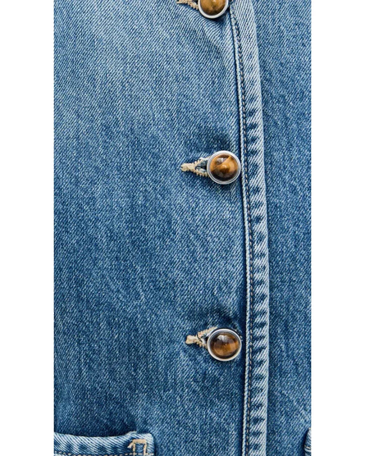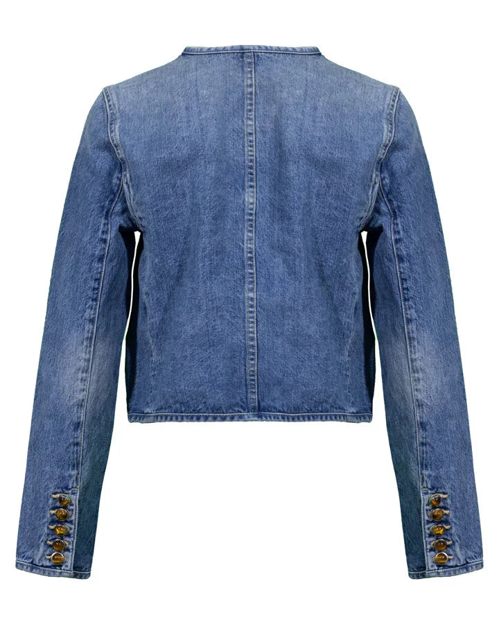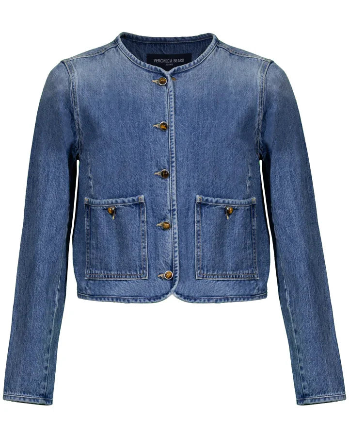 Veronica Beard non-stretch denim short jacket with a crew neck, adorned by novelty buttons on button front, button patch pockets and five buttons on the long sleeve cuffs.