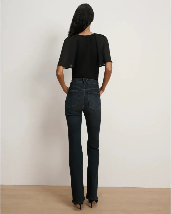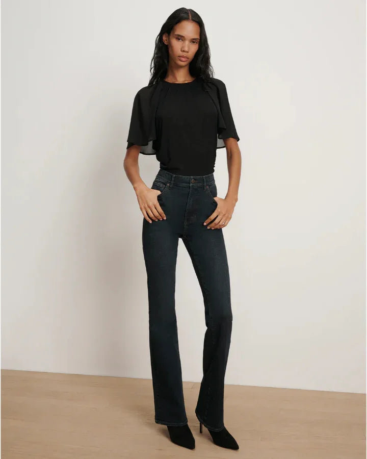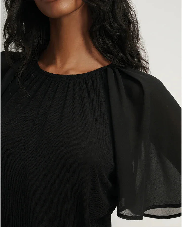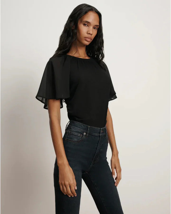 Veronica Beard body skimming fit, soft ribbed stretch blend t-shirt with a ruched knit bodice accented with fluttery chiffon sleeves. A high neckline with gathered detailing completes the look, echoing the fluid shape of the sleeves. Size S - Length 21", Sleeve Length 15.5".