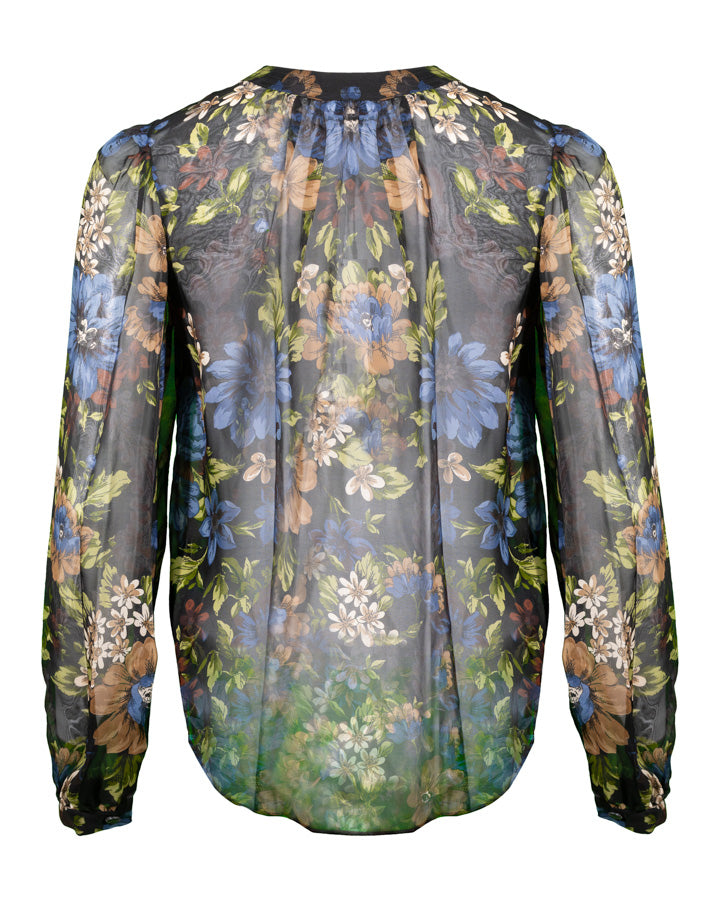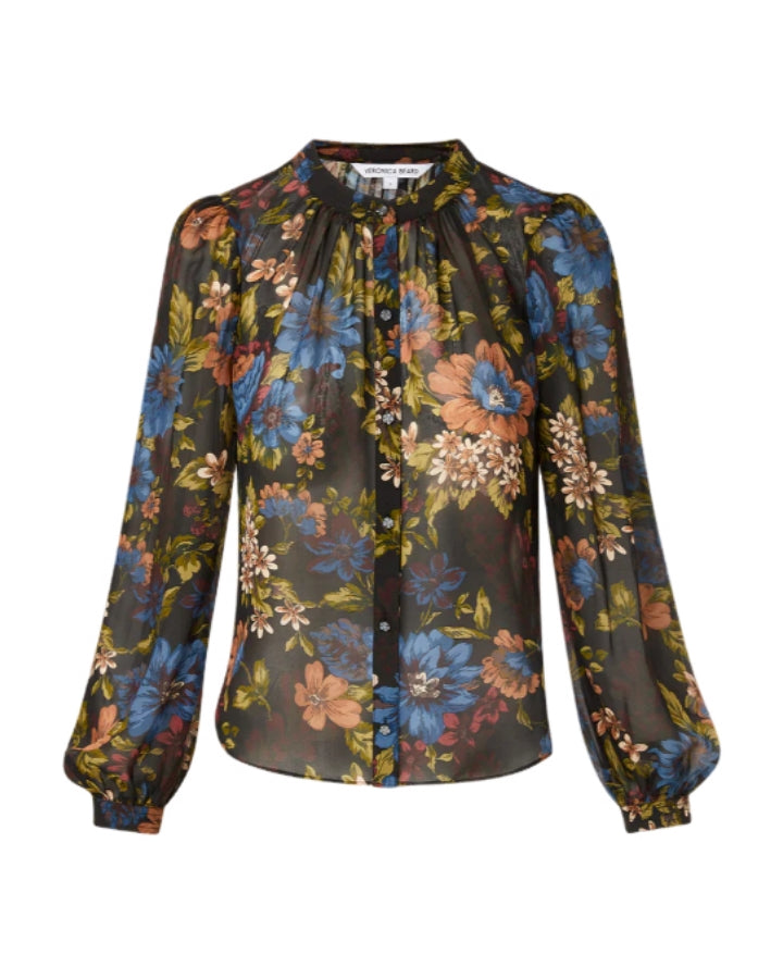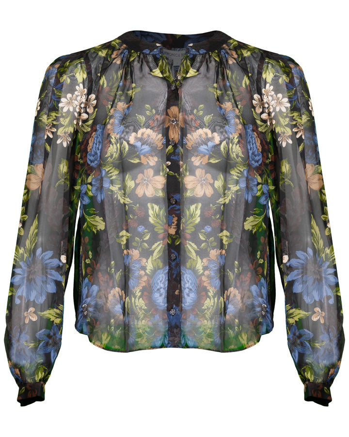 Veronica Beard Ashlynn Blouse with a delicate, night flower garden design. Flower-shaped buttons at the front.