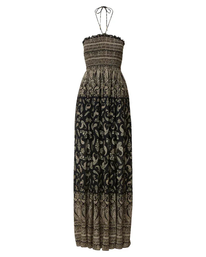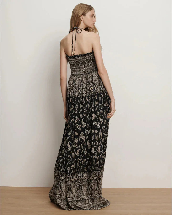 Veronica Beard Bohemian romance maxi dress in a lightweight cotton blend features an all-over paisley print in black and beige. A smocked, ruffle-trimmed bodice with bead-and-tassel halter straps define shape, while a full A-line skirt adds breezy movement. Finished with slanted side pockets, it’s a versatile, packable piece. Size S - Length 60".