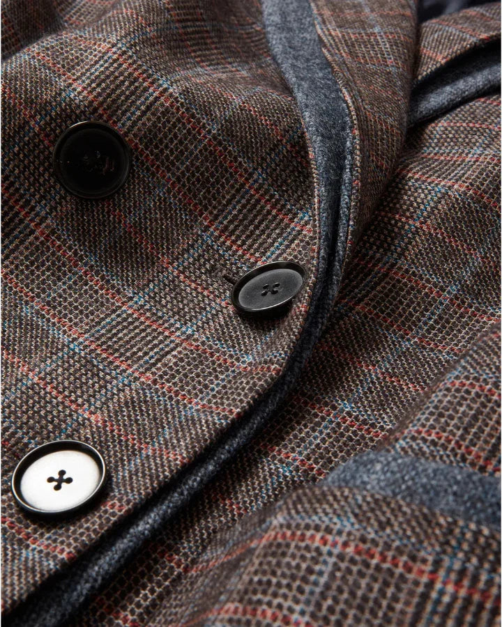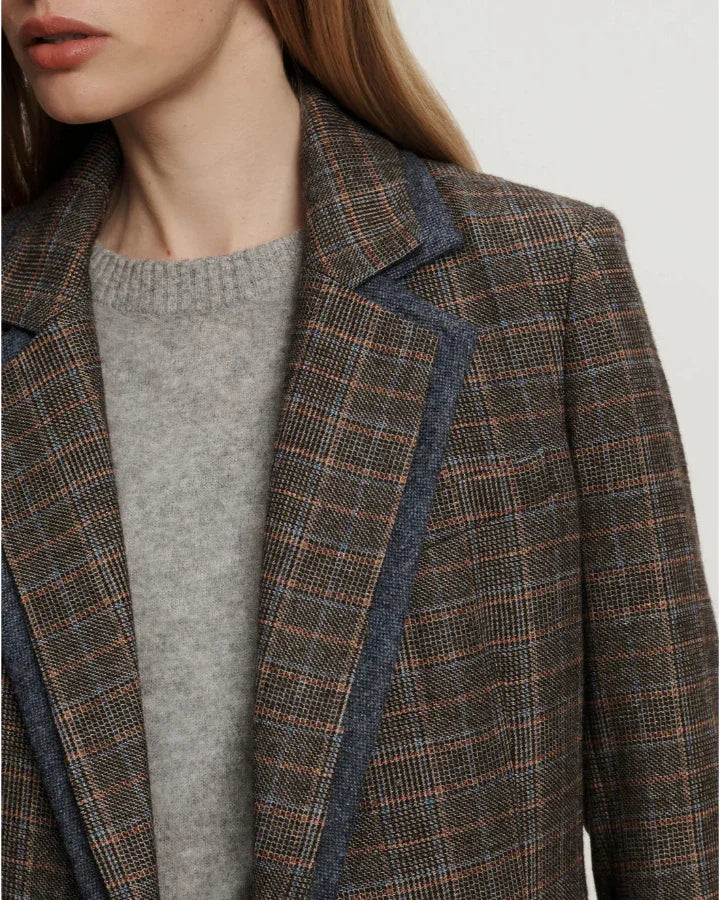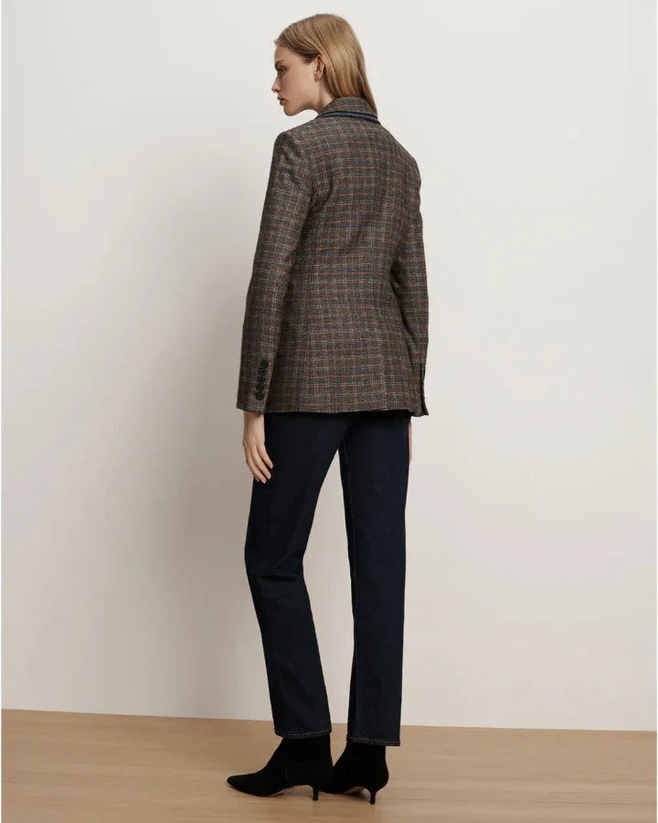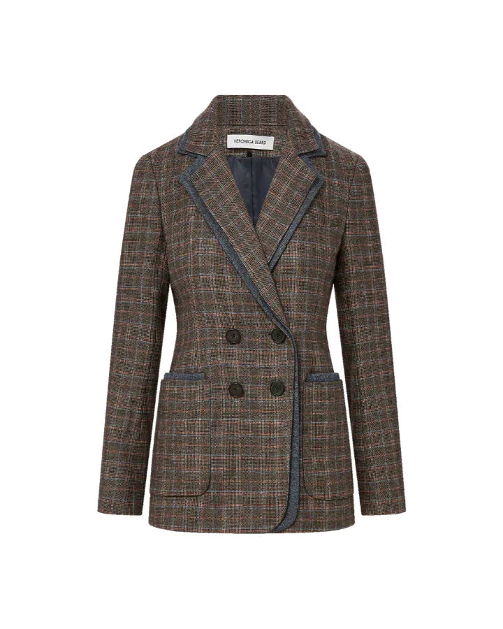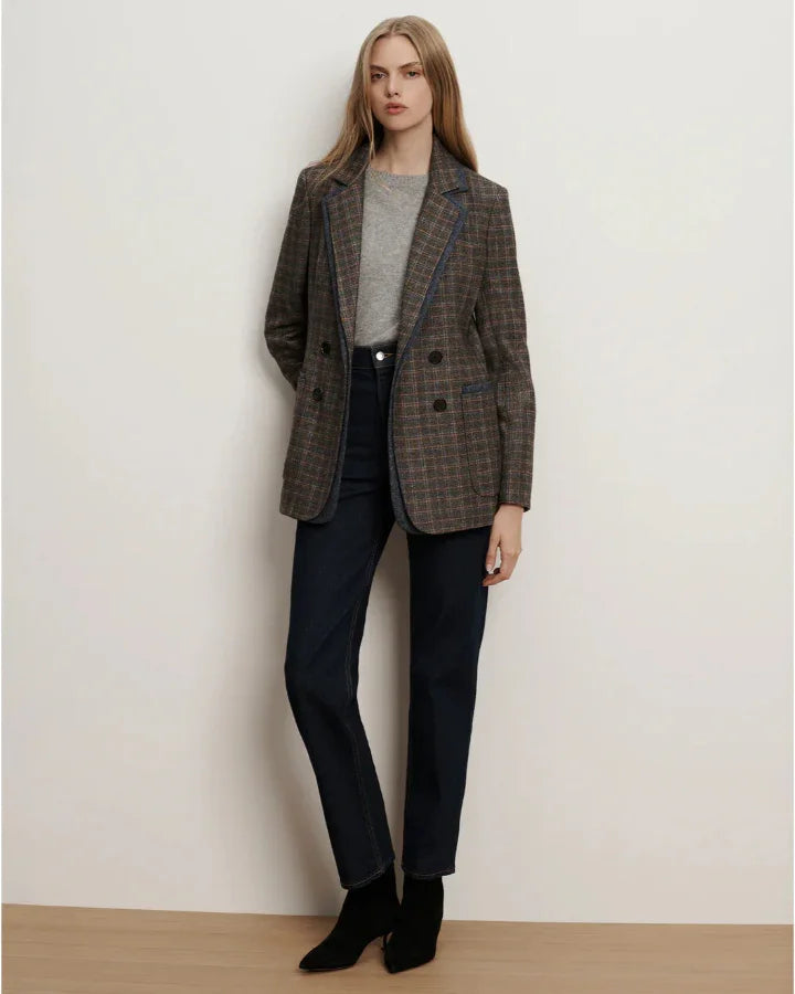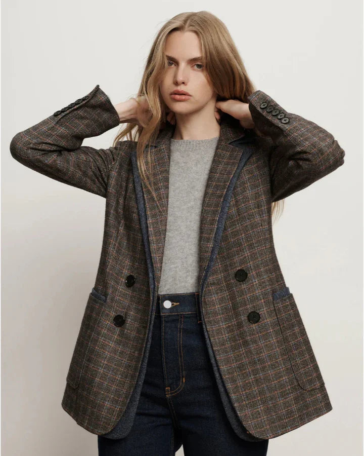 Veronica Beard boxy, oversized fit tailored plaid dickey jacket with classic notch lapel—double layered in contrast birdseye tweed. Matching welt pockets and a double-breasted closure complete the look. Size 2 - Length 29", Sleeve Length 32.25".