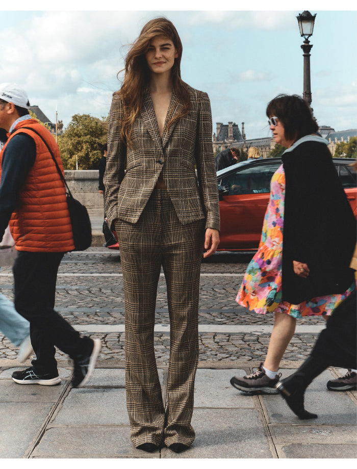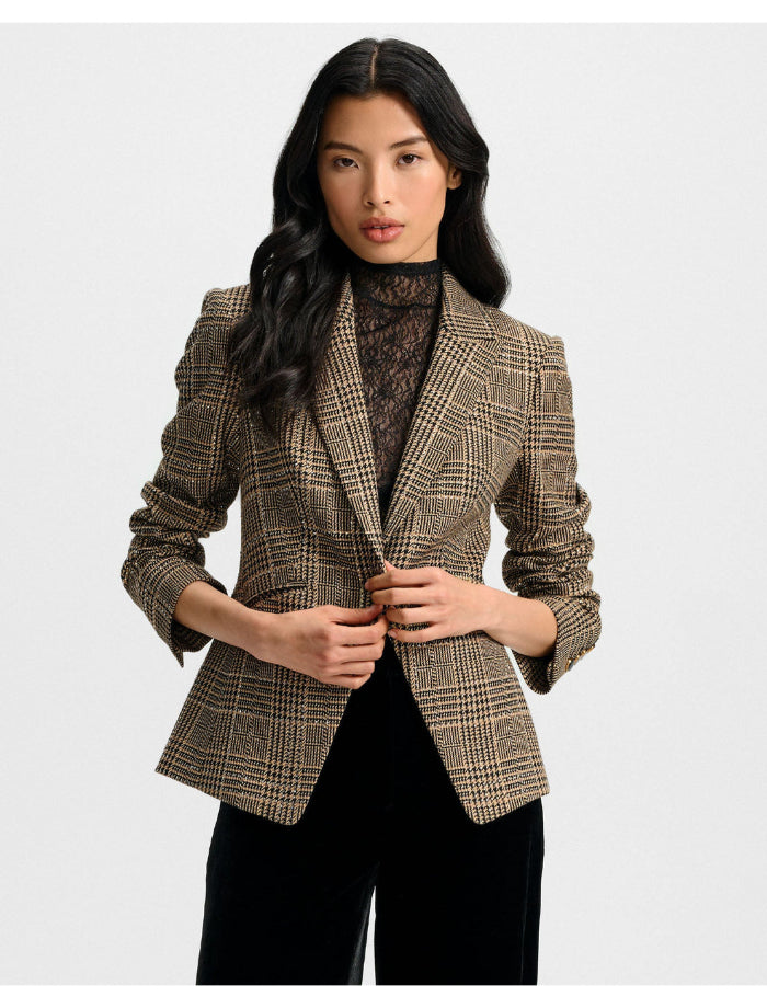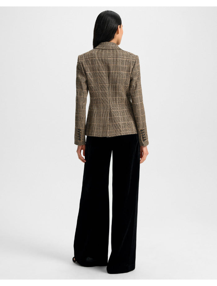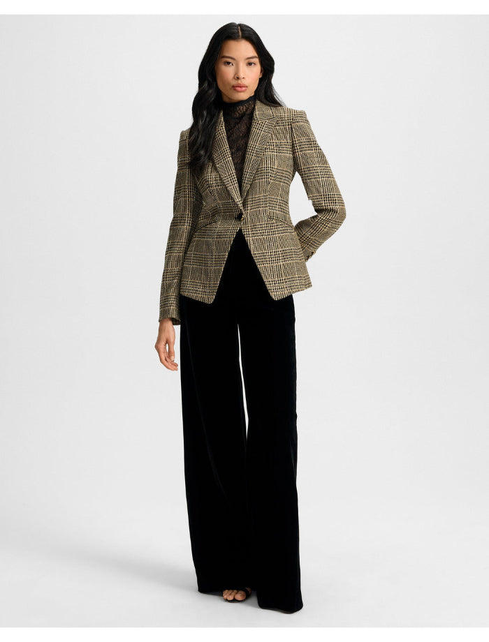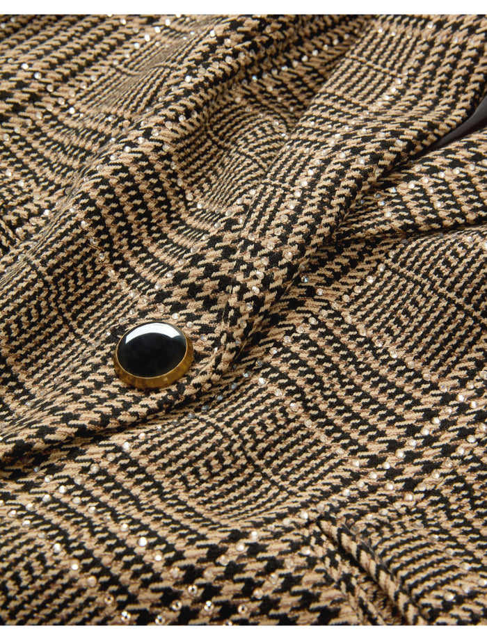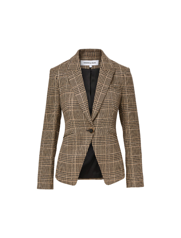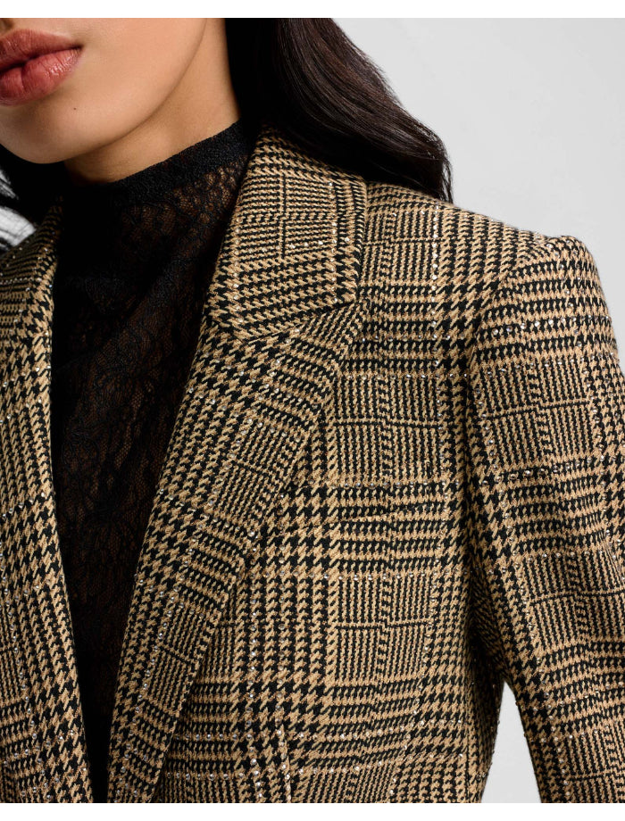 Veronica Beard Kendryn classic tailored blazer in a glen plaid design with allover crystal embellishments for a subtle sparkle. Features a cutaway hem, angled welt pockets, and a single button closure.