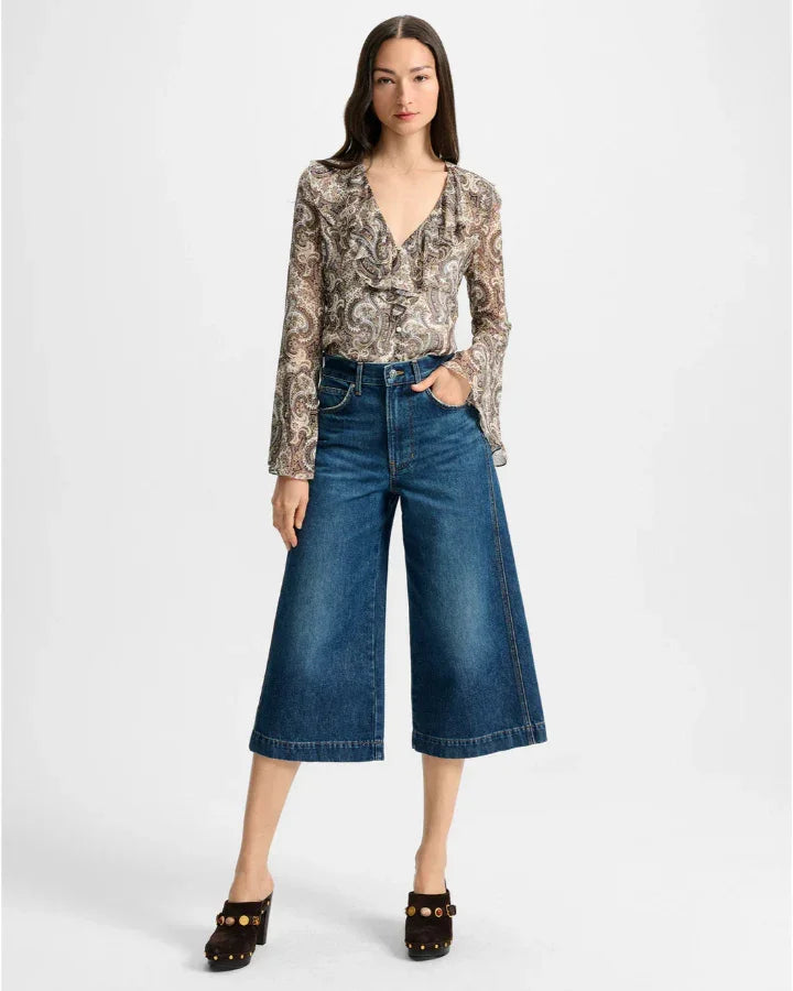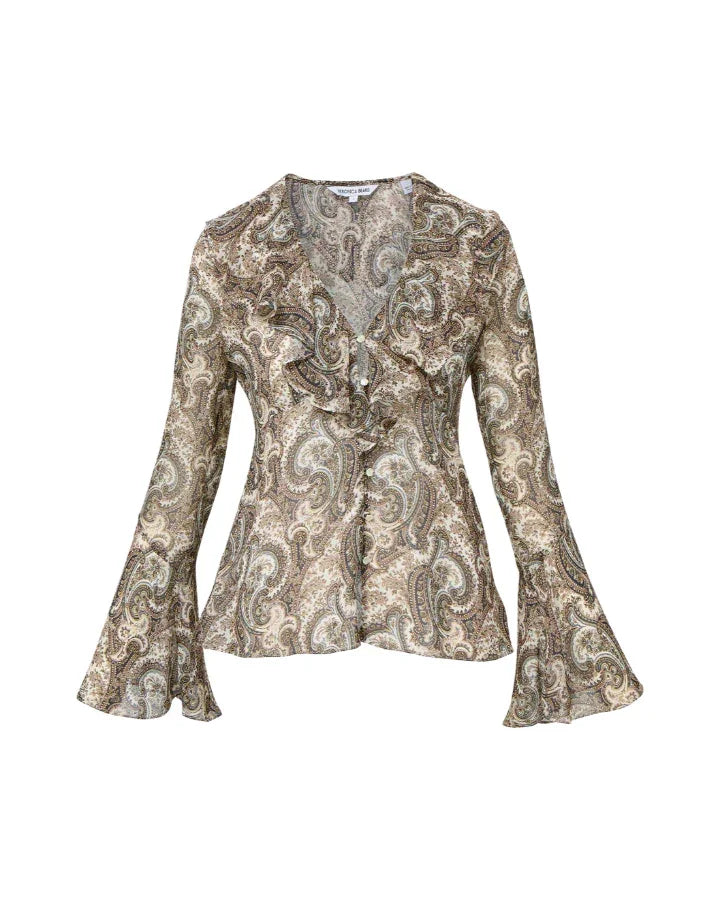 Veronica Beard light and airy silk georgette custom paisley pattern blouse. Features a ruffled v-neckline adds soft volume through the bodice, while floral shell buttons down the front lend delicate contrast and sheer bell sleeves. Size 2 - Length 24.75", Sleeve Length 32.25".