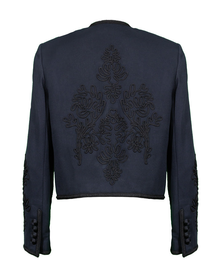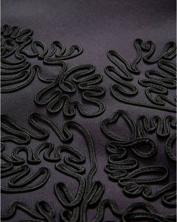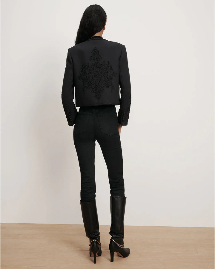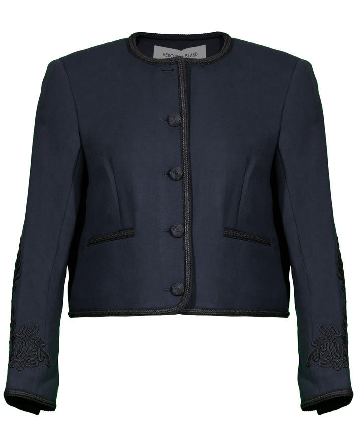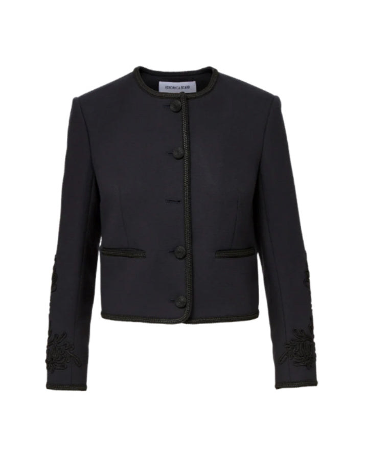Veronica Beard Latrell structured square jacket edged in slightly shimmering black detail, also found in embroidery at the sleeves. Black buttons on the front.