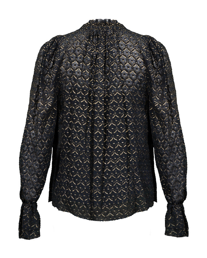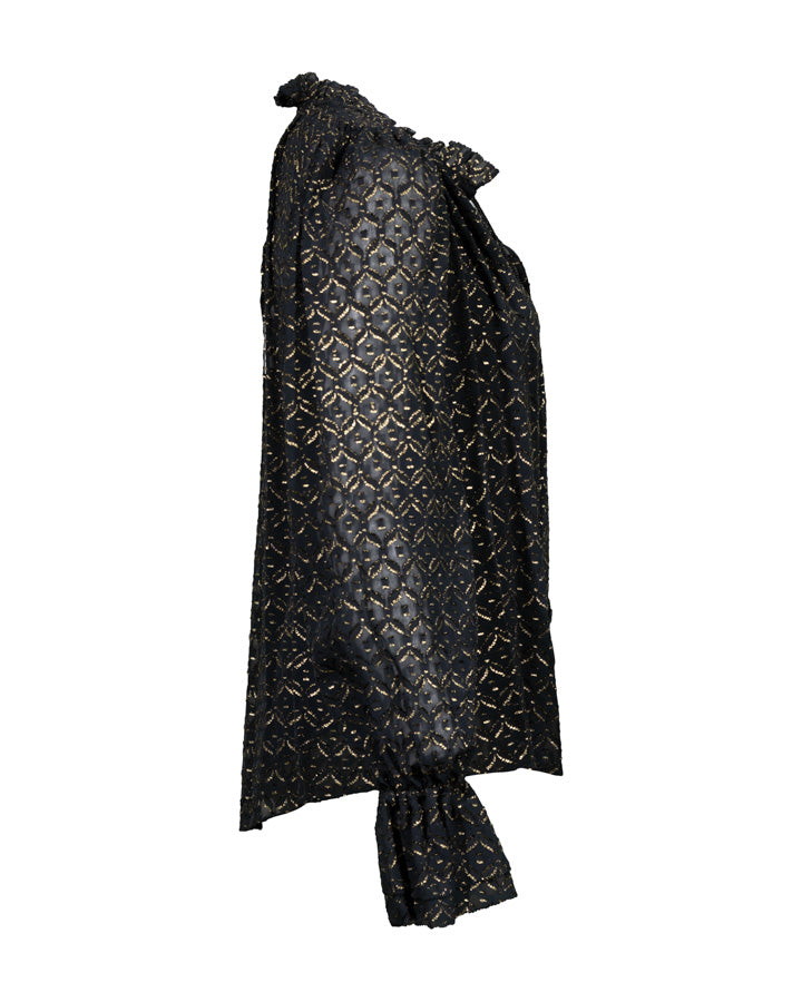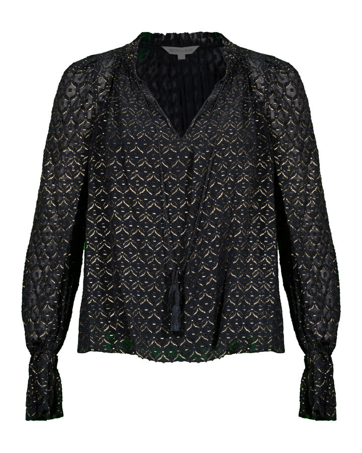 Veronica Beard Maxime blouse in a brilliant golden scalloped pattern, with a V-neck ending in satin tassels and gathered flowing sleeves.