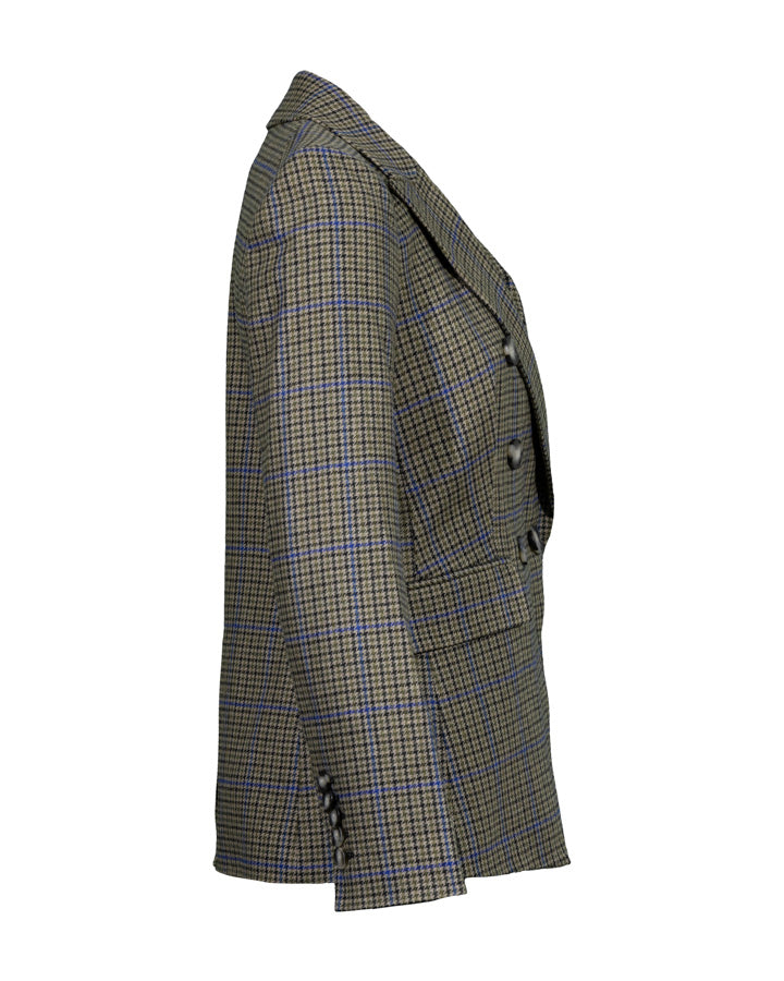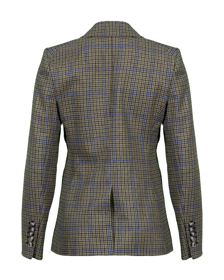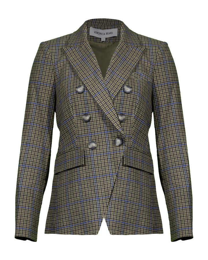 Veronica Beard Miller Dickey jacket in a neutral classic plaid design offset by a cobalt blue line threaded through.