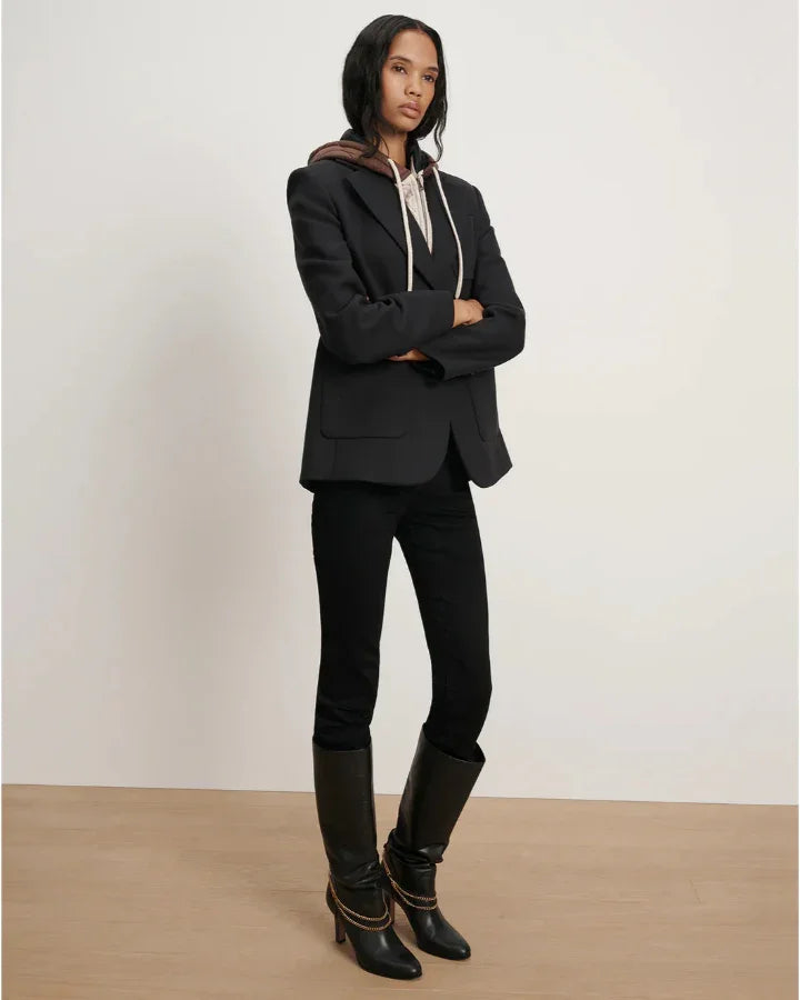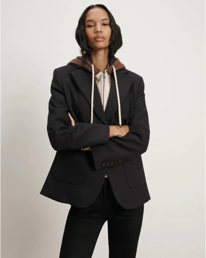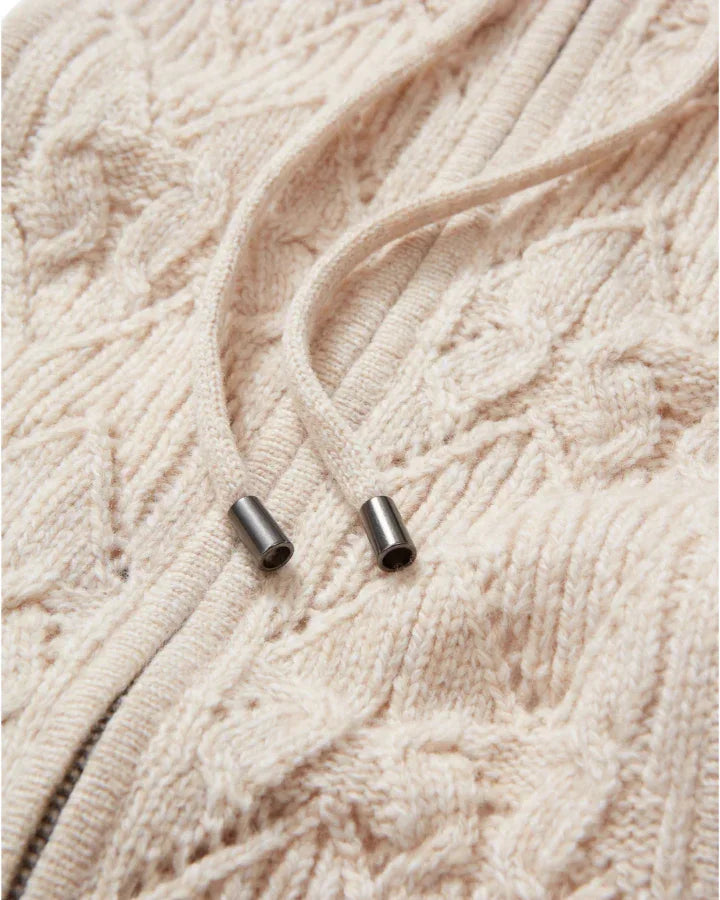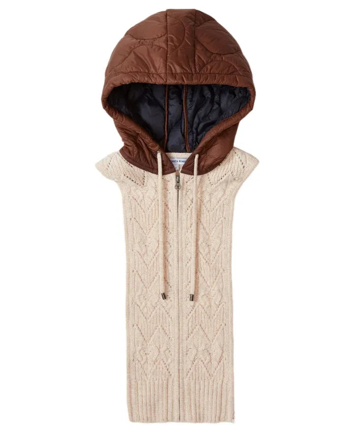Veronica Beard cable knit dickey with a contrast quilted hood for added warmth and protection from the elements. Finished with ribbed trimming, zip closure and an adjustable drawstring for a custom fit.
