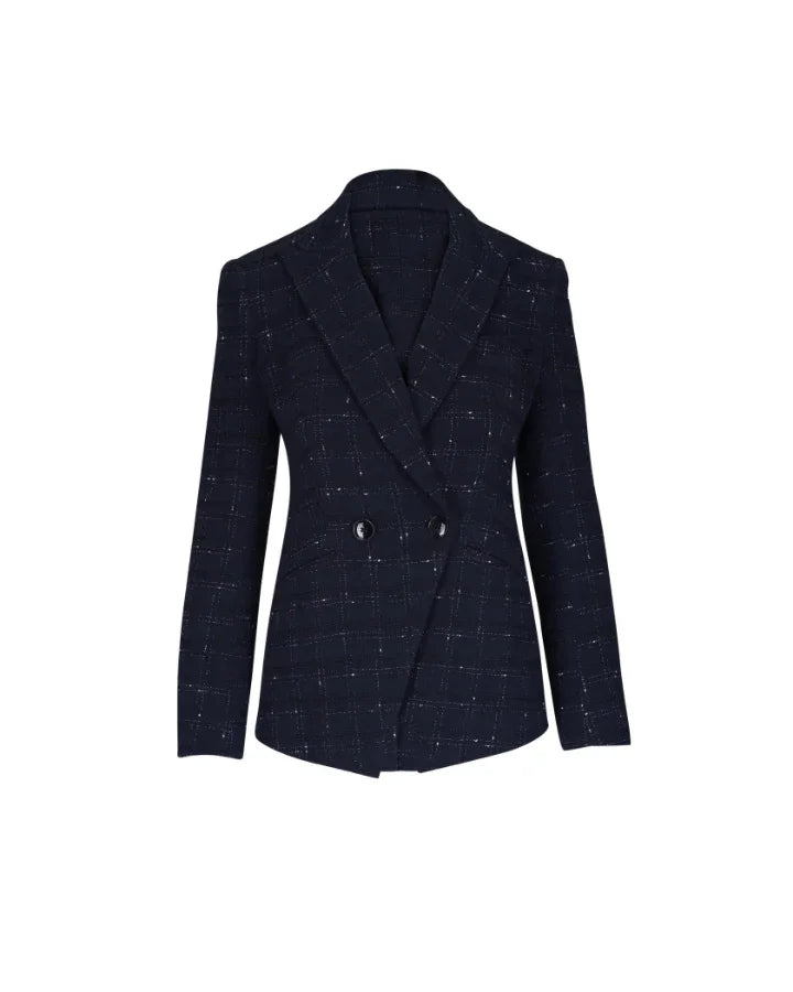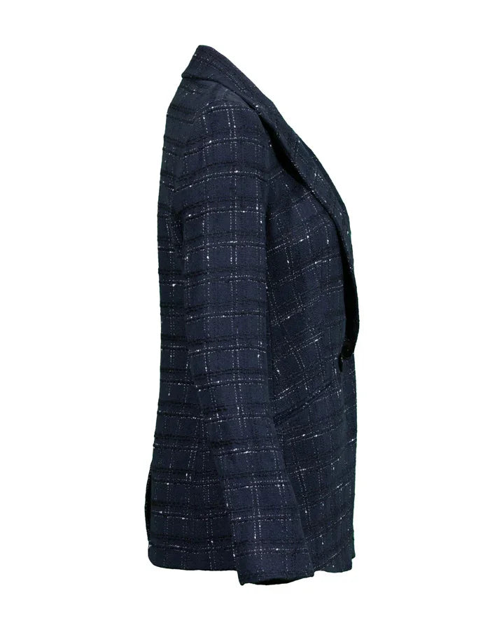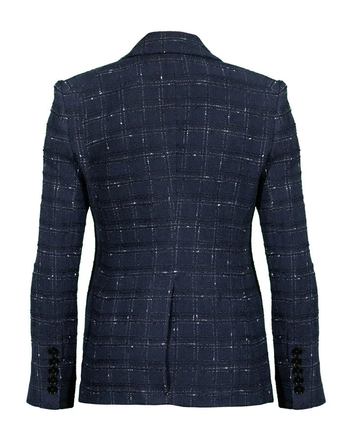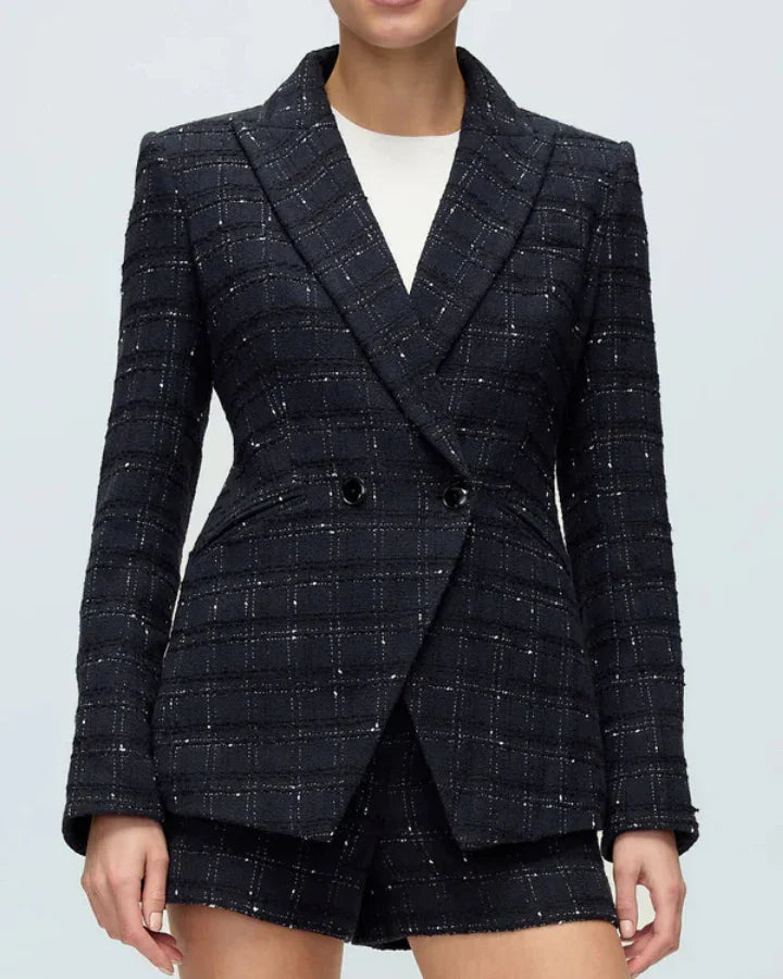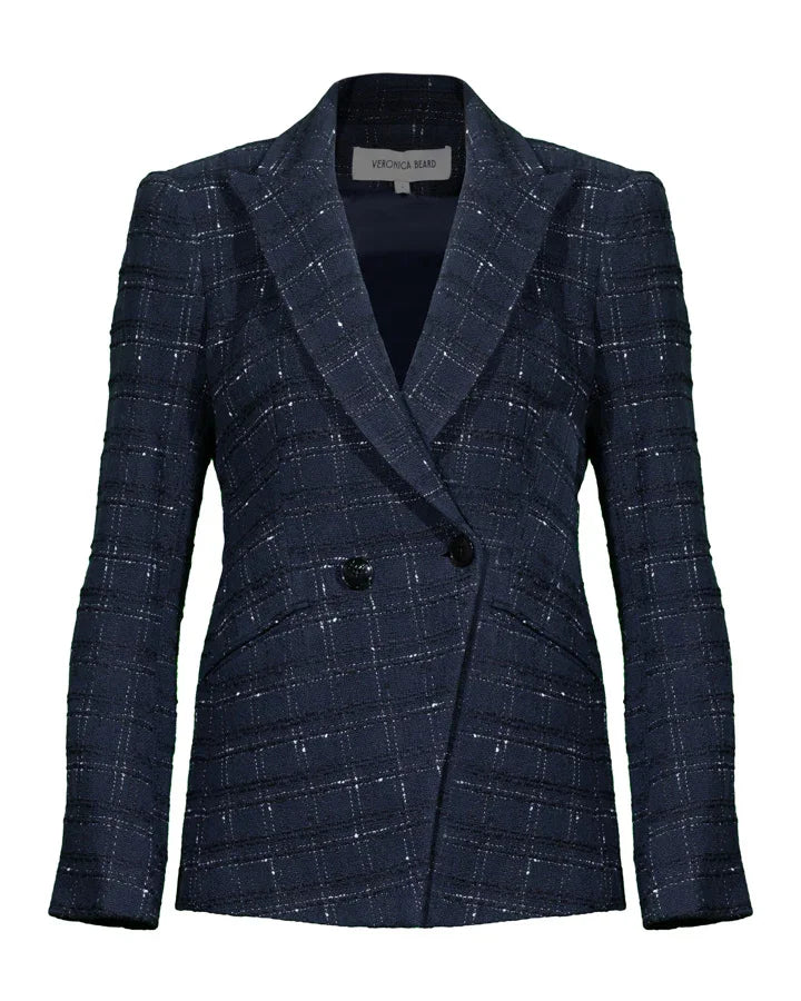 Veronica Beard tailored tweed checkered print dickey jacket with notched lapel, angled welt pockets, double breasted silhouette that subtly cinches at the waist when fastened.