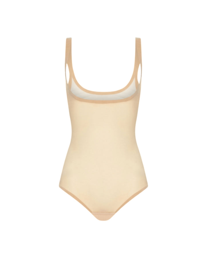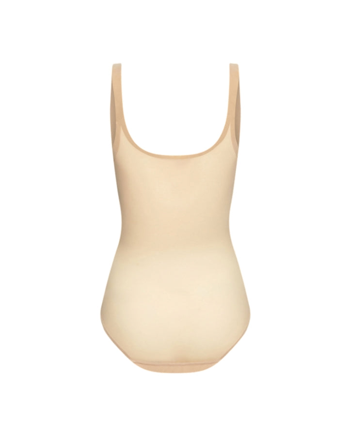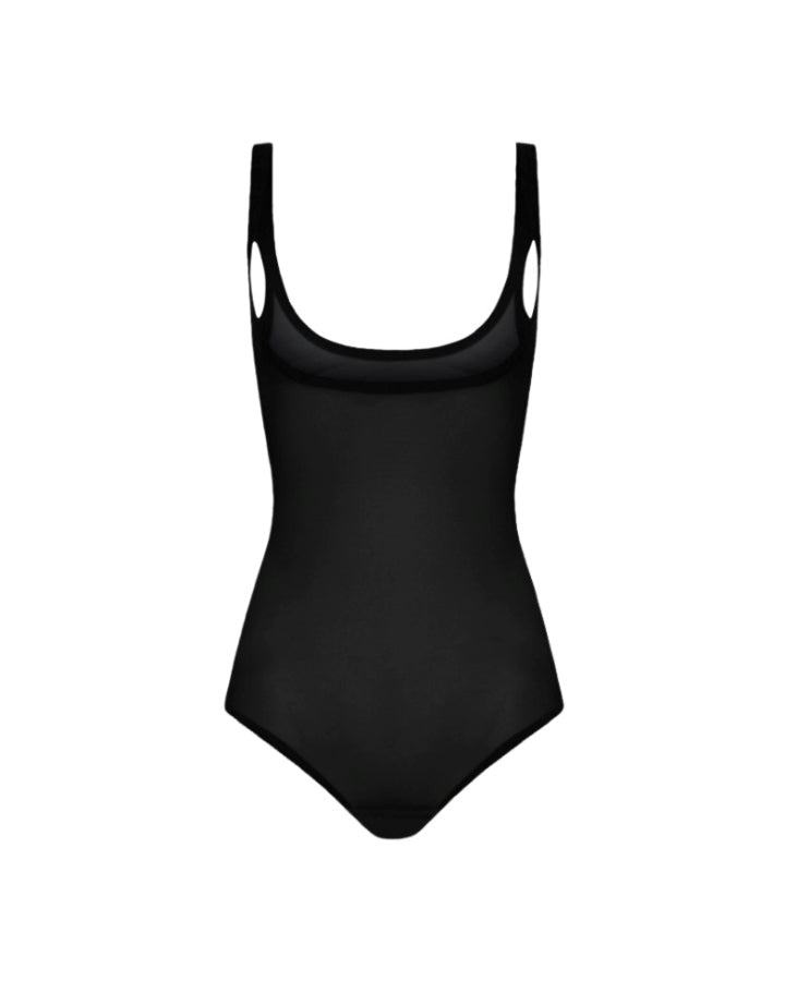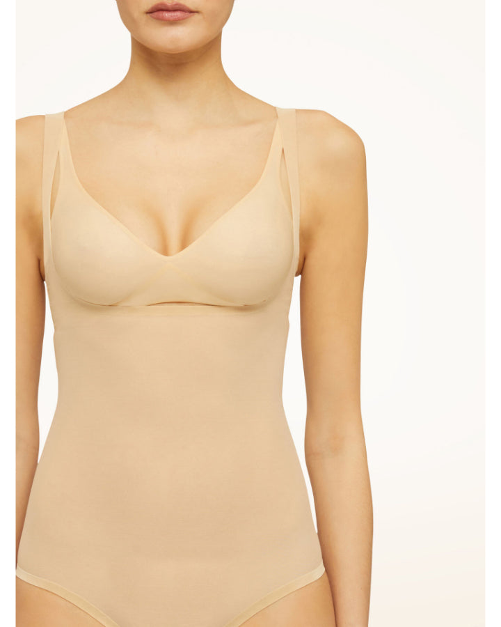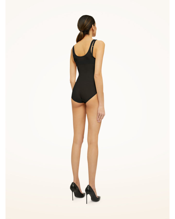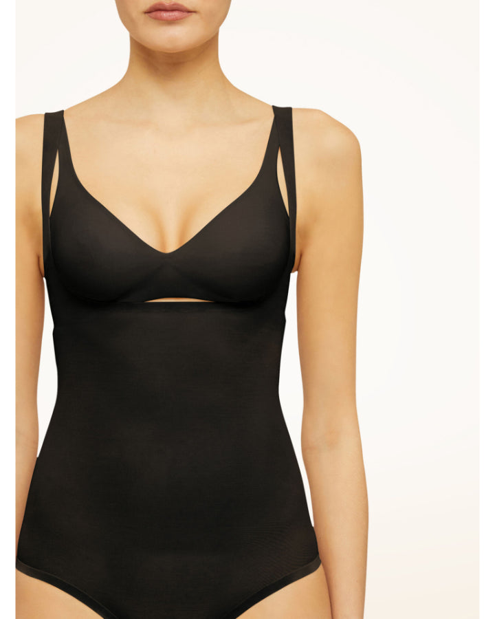 Wolford light shaping, nearly invisable body suit that you can wear your own bra, thanks to its innovative neckline. Soft, lightly sheer tulle efficiently contours the waist and stomach. The satiny, seamless finishes and straps provide ultimate comfort.